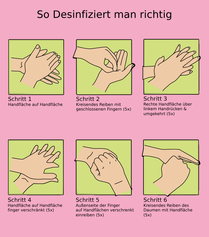 - Die Hände sollten trocken sein, bevor Desinfektionsmittel aufgetragen wird